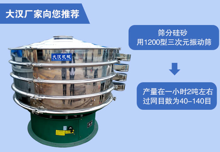 近期有客戶詢問我們銷售客服問篩分烘干后的硅砂產(chǎn)量在一小時2噸左右,過網(wǎng)目數(shù)為40-70目、70-140目適合用什么型號的振動篩,小編根據(jù)客戶所篩分的物料與過網(wǎng)數(shù)目和產(chǎn)量推薦使用1200型三次元振動篩