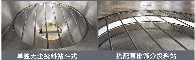 設(shè)置格柵,有效防止PE袋與粉末接觸,并配有振動篩(一般是直排篩或旋振篩),可有效攔截異物,確保出料合格。