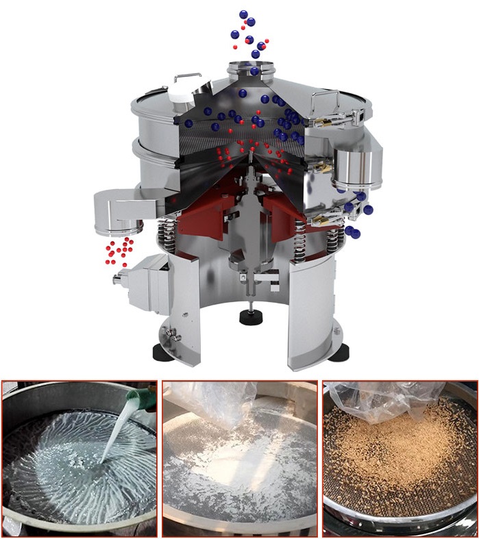 氣旋篩使用一組槳葉將產(chǎn)品推出篩網(wǎng)圓柱體,高速旋轉(zhuǎn)它們并對產(chǎn)品施加離心力,圓柱體水平安裝,因此對槳葉施加輕微的扭轉(zhuǎn)以將產(chǎn)品沿著圓柱體的長度向下移動,并且使用螺旋鉆以穩(wěn)定的速度喂入槳葉。與振動篩相比,這些槳葉迫使產(chǎn)品通過篩網(wǎng),從而使它們具有更高的吞吐量,旋轉(zhuǎn)螺旋鉆和槳葉組件的運動具有分解塊或分離壓實產(chǎn)品的額外好處。