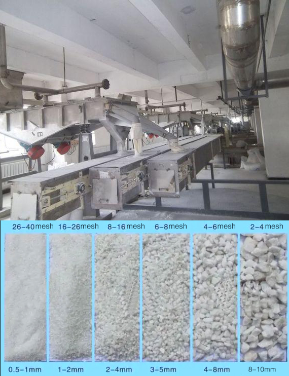 石英砂直線篩主要用于石英砂的初篩和分級(jí),粒度范圍為1—0.5mm、0.5—0.1mm、0.1—0.01mm、0.01—0.005mm。