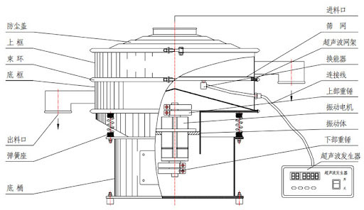 流通式超聲波篩工作時(shí),超聲波換能器將高頻電能轉(zhuǎn)化為高頻機(jī)械振動(dòng)并傳遞至篩網(wǎng),使篩網(wǎng)產(chǎn)生3.6萬(wàn)次 / 秒的高頻微幅振動(dòng),帶篩分物料從上方進(jìn)料口進(jìn)入篩機(jī)后,在高頻振動(dòng)力的作用下,物料快速向四周散開(kāi)的同時(shí),還能有效破除物料顆粒間的粘附、團(tuán)聚現(xiàn)象,防止顆粒堵塞篩孔,合格物料通過(guò)篩網(wǎng)由下出料口排出,不合格的大顆粒物料則沿篩面移動(dòng)至排渣口排出。