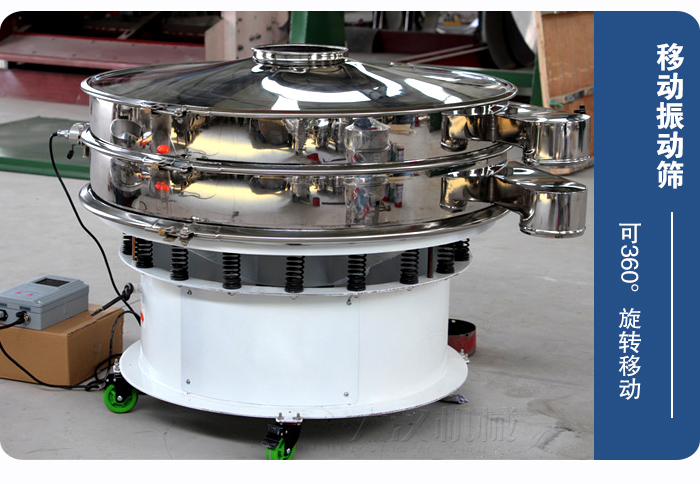 該設(shè)備底部加裝萬(wàn)向旋轉(zhuǎn)輪,可360°旋轉(zhuǎn)移動(dòng),所以稱(chēng)之為:移動(dòng)振動(dòng)篩