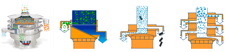 | 應(yīng)用 | 要用于物料原料的篩分和成品的最終生產(chǎn)檢驗(yàn),可以去除產(chǎn)品中的結(jié)塊和污染物,一次操作最多可提供5級(jí)分級(jí)。 | 適合高粘性、高靜電細(xì)粉,篩分精度可以提高80%以上,產(chǎn)量提高2-5倍。 | 模擬人工篩分的動(dòng)作,產(chǎn)生了水平和投擲的三維滾動(dòng)運(yùn)動(dòng),適用于500目以?xún)?nèi)的細(xì)粒狀物料,篩分精度提高了90-95%,產(chǎn)量是圓形振動(dòng)篩的5-10倍。 | 適合一般的粗略篩分或除雜,的進(jìn)、出料口設(shè)計(jì)在同一垂直方向上,這樣會(huì)加快物料的排料速度,處理量是普通圓形振動(dòng)篩的2-5倍。 | 經(jīng)常用在液體過(guò)濾行業(yè),可去除液體或懸浮物中存在的不需要的顆粒,當(dāng)然也是可以作為粉末除雜??捎迷谔幚砹枯^小的工廠或小型作坊。 |